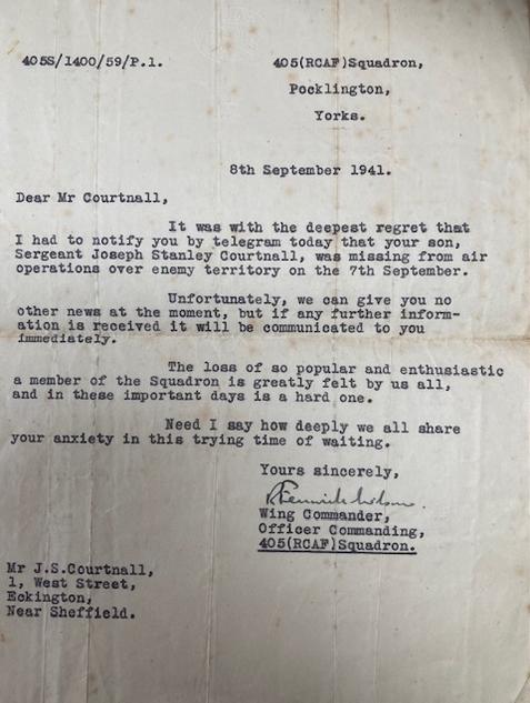 The rest of the crew returned to Pocklington and 405 Squadron the following day in an aircraft that was flown down to Plymouth to collect them. Sgt Courtnall and F/Sgt Perkin were on board Wellington W5521 on 7th / 8th September 1941 when they failed to return and spent the rest of the War as PoW's. Sgt Courtnall's full identity was probably Joseph Stanley Courtnall who died in Chesterfield, UK in 2003, someone with the same name (possibly his father) served in the RAF in WW1.